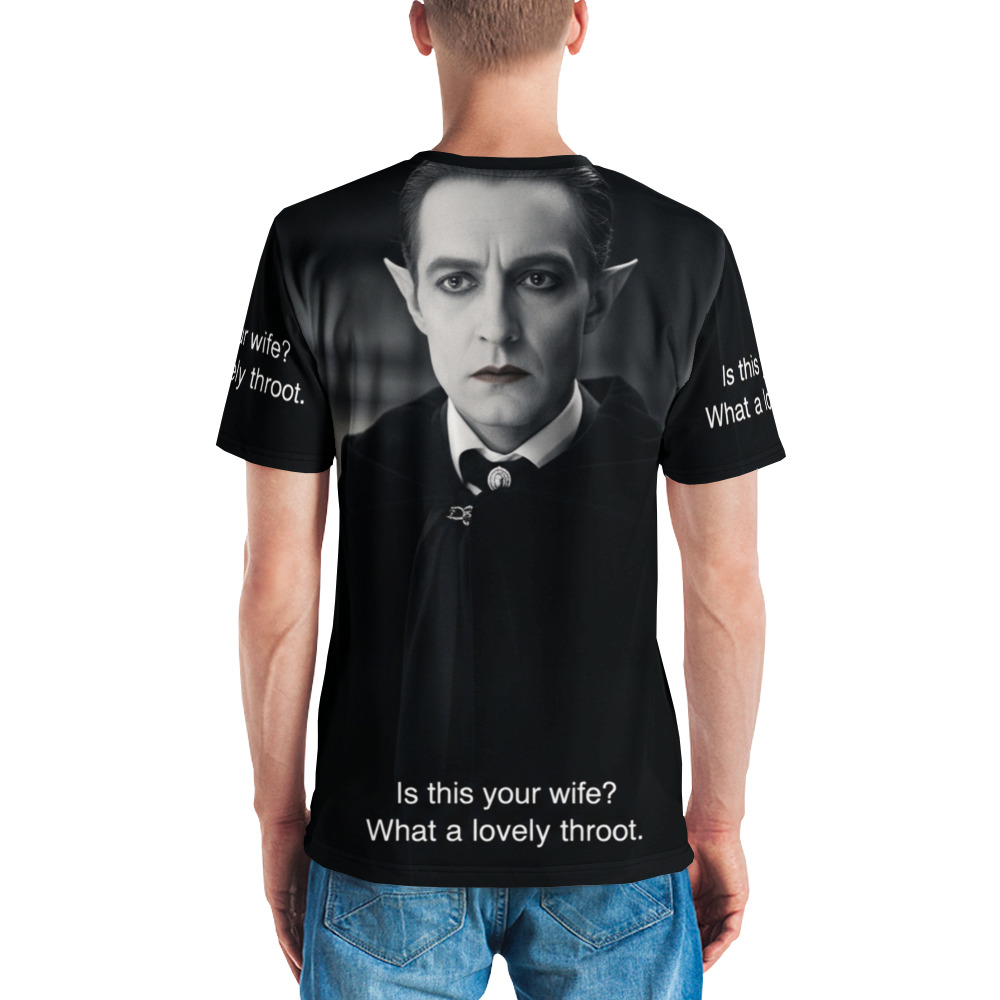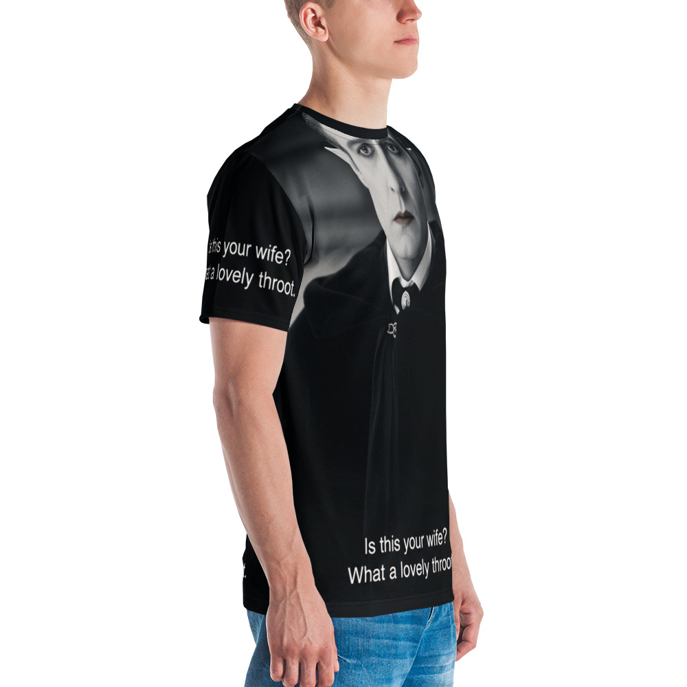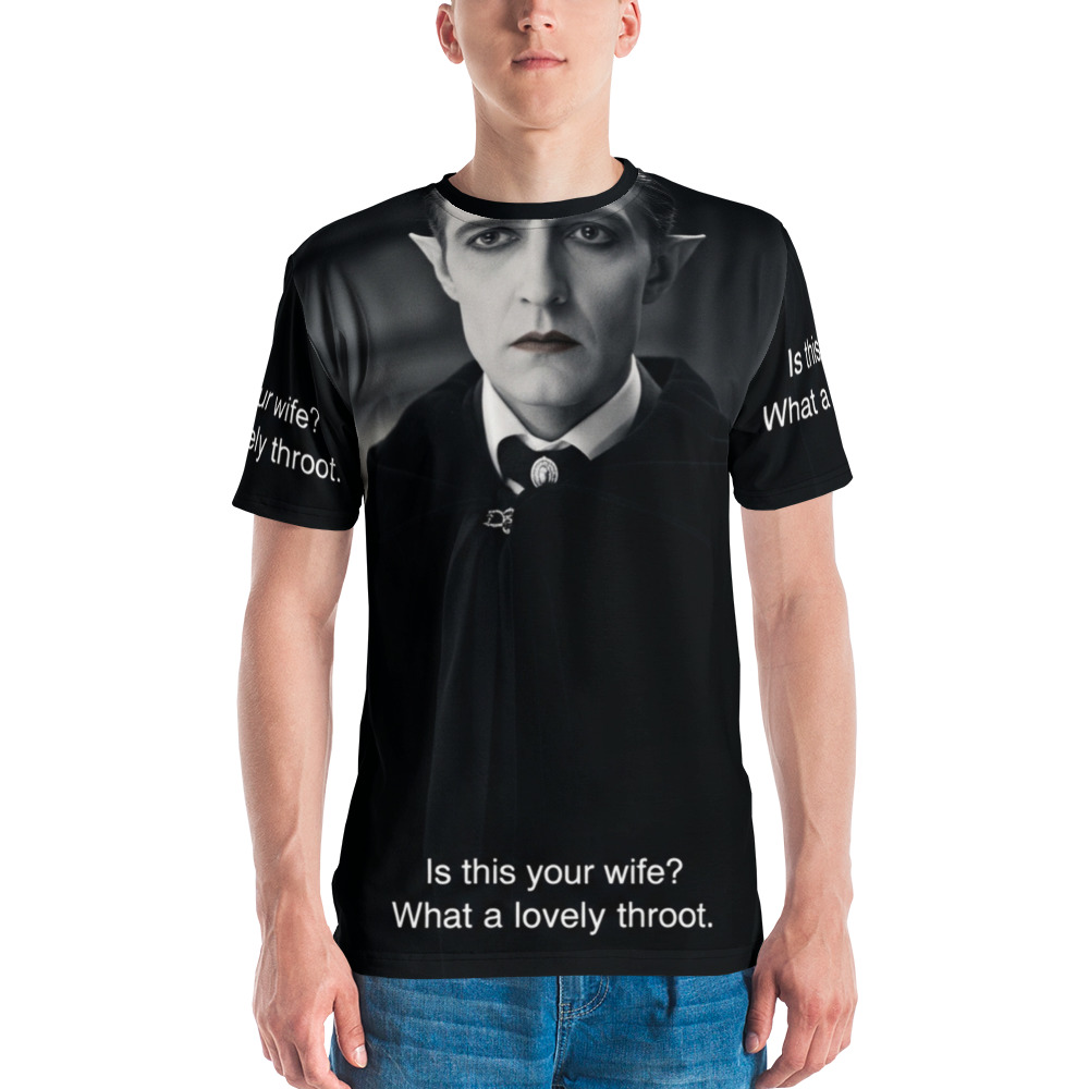 Step into the chilling, atmospheric shadows of early German Expressionism with The Lovely Throat 1922 Graphic Tee. Far more than just a comfortable everyday t-shirt, this strikingly dark, all-over print design is a wearable tribute to F.W. Murnau’s legendary 1922 silent horror masterpiece, Nosferatu: A Symphony of Horror. Featuring a haunting, stylized portrait of the iconic vampire Count Orlok alongside one of the most famously unsettling intertitle quotes in cinematic history—”Is this your wife? What a lovely throat.”—this shirt perfectly captures the eerie, creeping dread that defined the very dawn of the horror genre. It is a chilling reminder of an era when stark, gothic text and elongated, silent shadows were more than enough to terrify theater audiences across the globe.