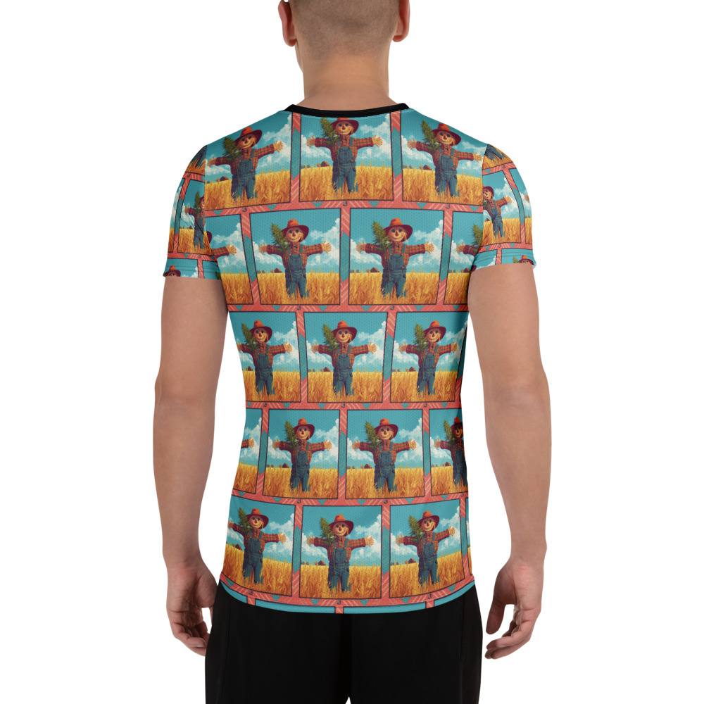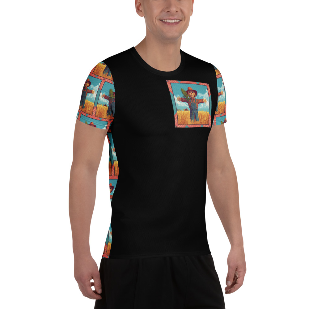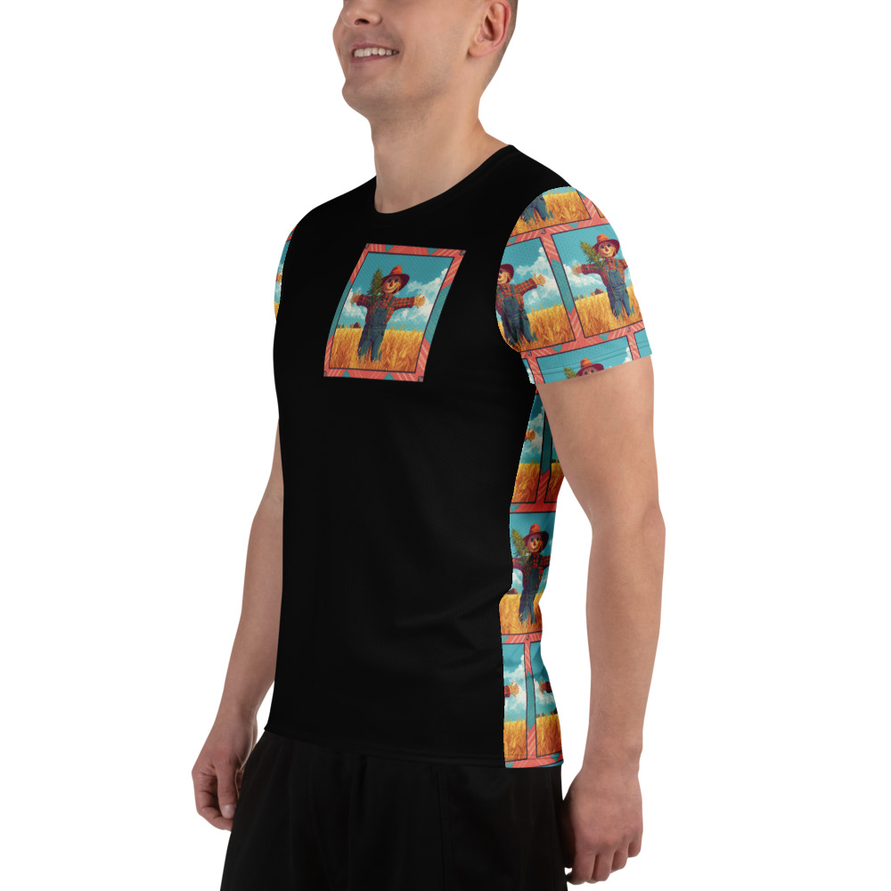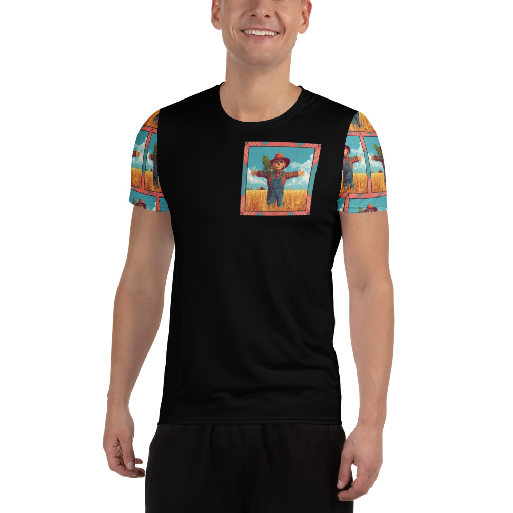 Step into the golden fields of classic slapstick comedy with The Silent Scarecrow 1920 Graphic Tee. While this sleek black t-shirt offers a highly modern, minimalist streetwear vibe with its framed pocket-sized chest graphic and uniquely patterned sleeves, it actually serves as a playful, wearable homage to Buster Keaton’s brilliant 1920 silent comedy short, The Scarecrow. Long before the era of digital effects, Keaton’s breathtaking physical comedy and fearless stunts captivated theater audiences worldwide. Featuring a charming, colorful illustration of a classic scarecrow standing amidst a golden wheat field, this design perfectly captures the rustic, rural backdrop where Keaton’s hilariously frantic farmhand famously posed as a decoy to escape a relentless dog.